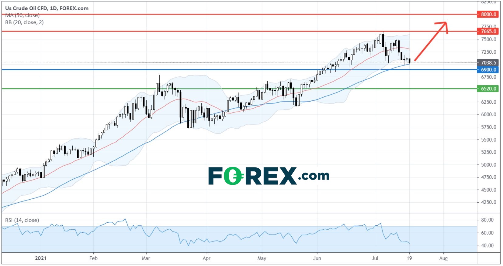 看涨的主要支持 (止损) 仍然设在6,900点 (近50日移动均线)。只要此位不破,美国原油CFD仍然有机会升回近日高位7,665点。