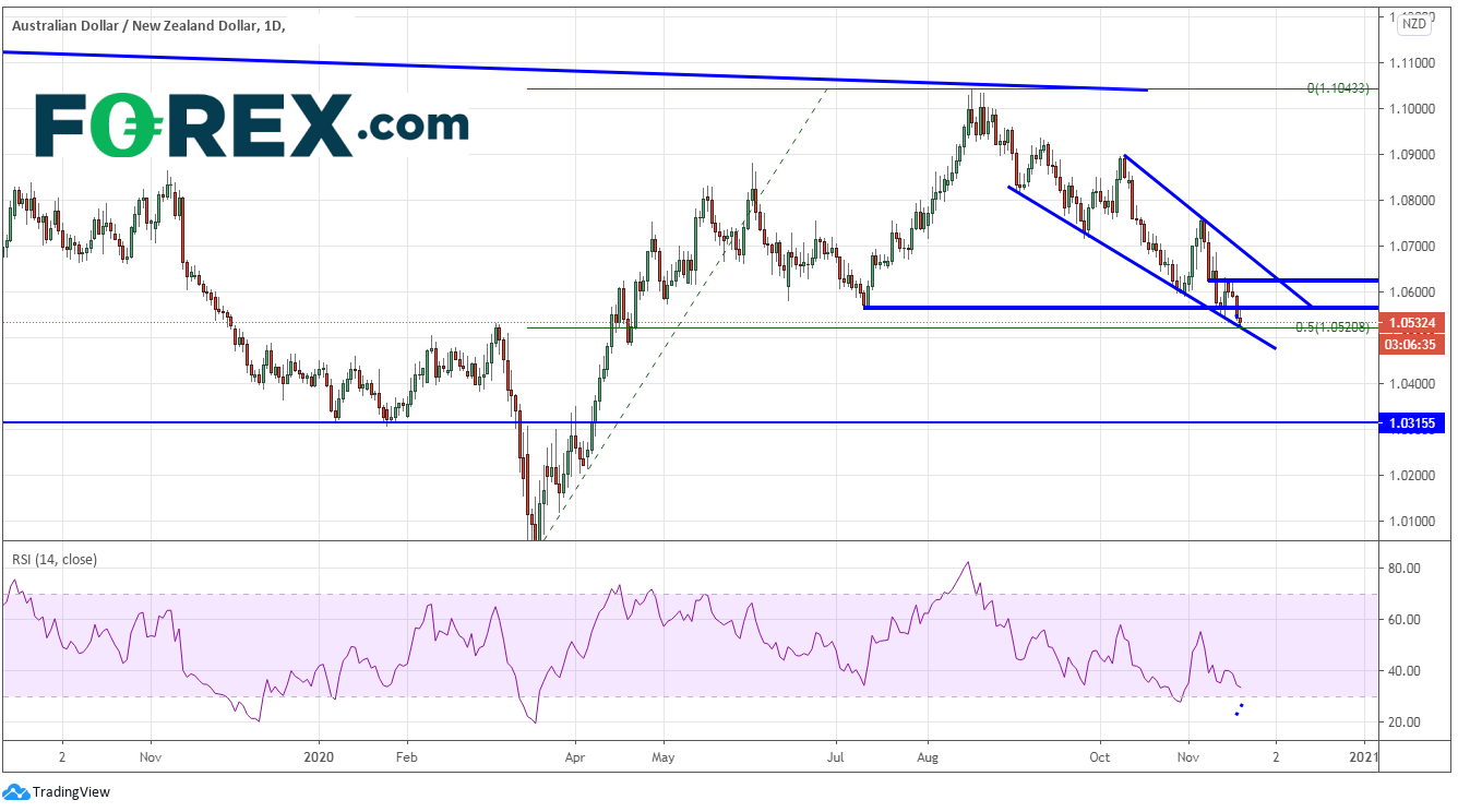 尽管澳元和纽元关系密切,但澳元/纽元今天同样走低 (很可能与美元有关,因为纽元也在回落)。但日线图框架下,多头或将此视为买入良机。货币对已探入趋势线支撑以及3月18日低点至8月18日高点上行之50%回档位。此外,RSI继续与价格背离,暗示反转可能在即。
