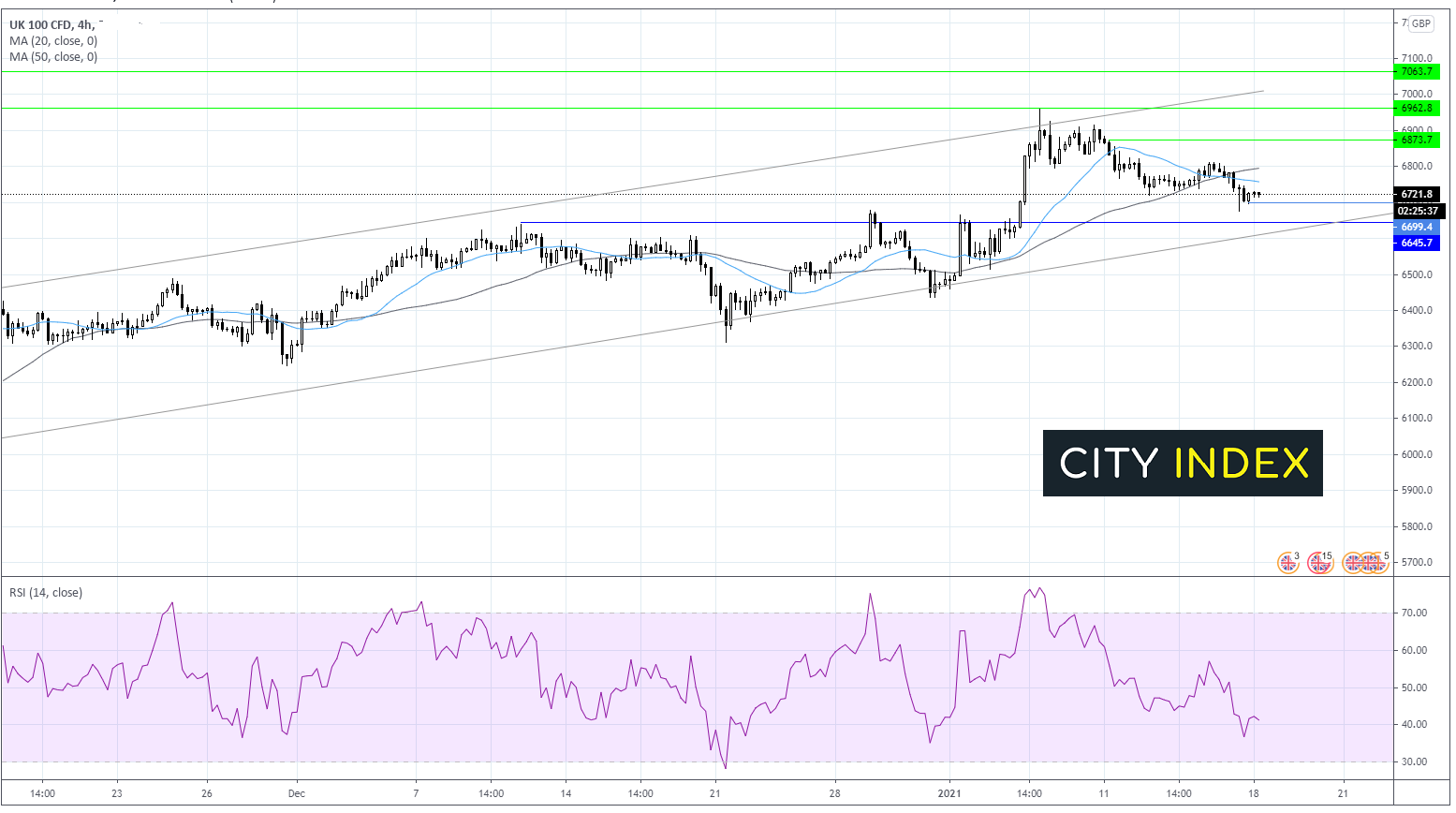 即时支撑位可见于6645隔夜低点,然后是水平支撑位6700。要打消短线看涨趋势,指数需下穿6645,然后是6615上升通道下轨。