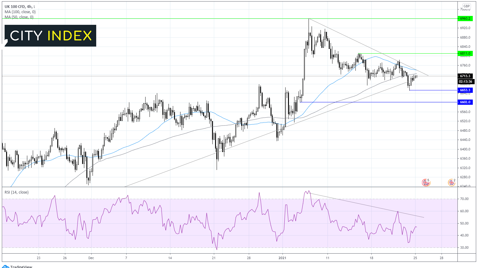 FTSE100指数4小时图正交投于其50和100期均线下方,也低于1月初以来的下降趋势线。