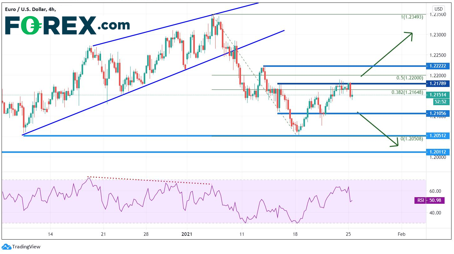 时间周期较短的4小时图上,欧元/美元从2020年12月9日起也构建了较短期的上升楔形。价格已于1月18日回撤到楔形的100%回档位目标1.2050附近,之后上涨至1月6日高点到1月18日低点的50%回档位附近,即1.2200下方不远处。日图旗形形态暗示走高,但若跌破1.2050,可能暗示回到日图上升楔形的下轨,即1.1605附近。第一支撑位在1.2105,然后是1.2050低点、前阻力位1.2010附近。阻力位先后落在1.2200附近、1.2222附近的前高点与1月6日高点1.2350附近。