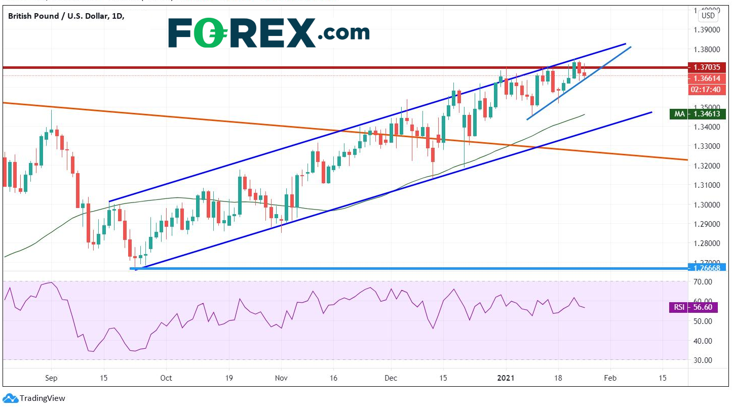 另外一对货币,英镑/美元,也正在形成一个潜在逆转形态。自2020年9月中旬以来,货币对一直处于上行通道内部。1月11日,英镑/美元开始构筑上升楔形。但英镑/美元未能收于水平阻力位1.3703和通道上升趋势线之上。汇价正在逼近上升楔形顶点。美元走高将导致英镑/美元下挫,跌破楔形上斜趋势线并探向1.3450目标位。50日均线也落在这个水平。若目标达成,下方看向1.3370附近通道底部趋势线。