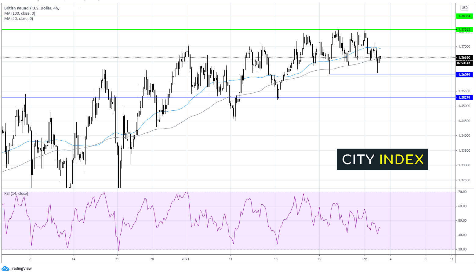 当前支撑位可见于100期均线1.3660、1月26日低点1.3605。如果攻克,可能涌现更多的空头。