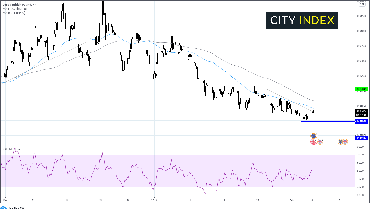 欧元/英镑自0.88反弹,在进入欧洲市场之前交投于日内高点附近,测试了1月26日以来的下降趋势线0.8830。