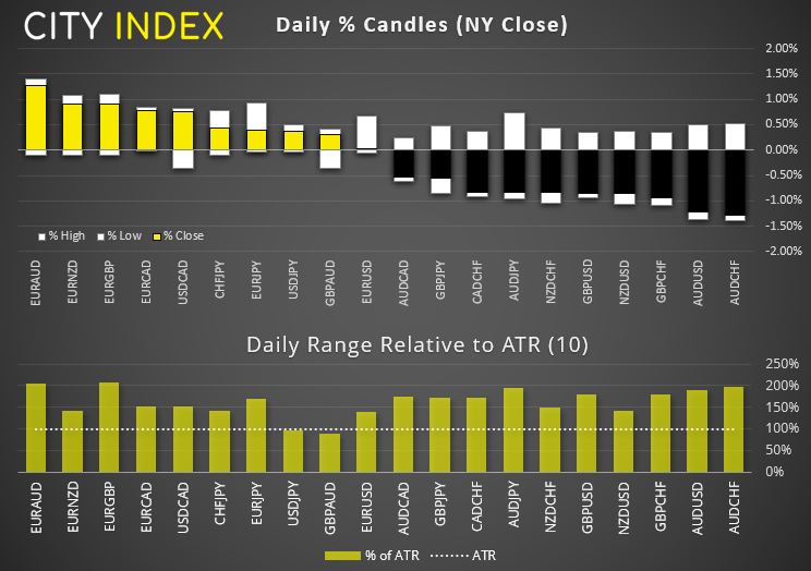 汇市今天震荡再起,我们追踪的主要货币和货币对行情都远超于真实波幅区间(ATR)。而澳元和欧元则达到ATR的200%左右。当然,波幅大并不意味着它们收于高点。