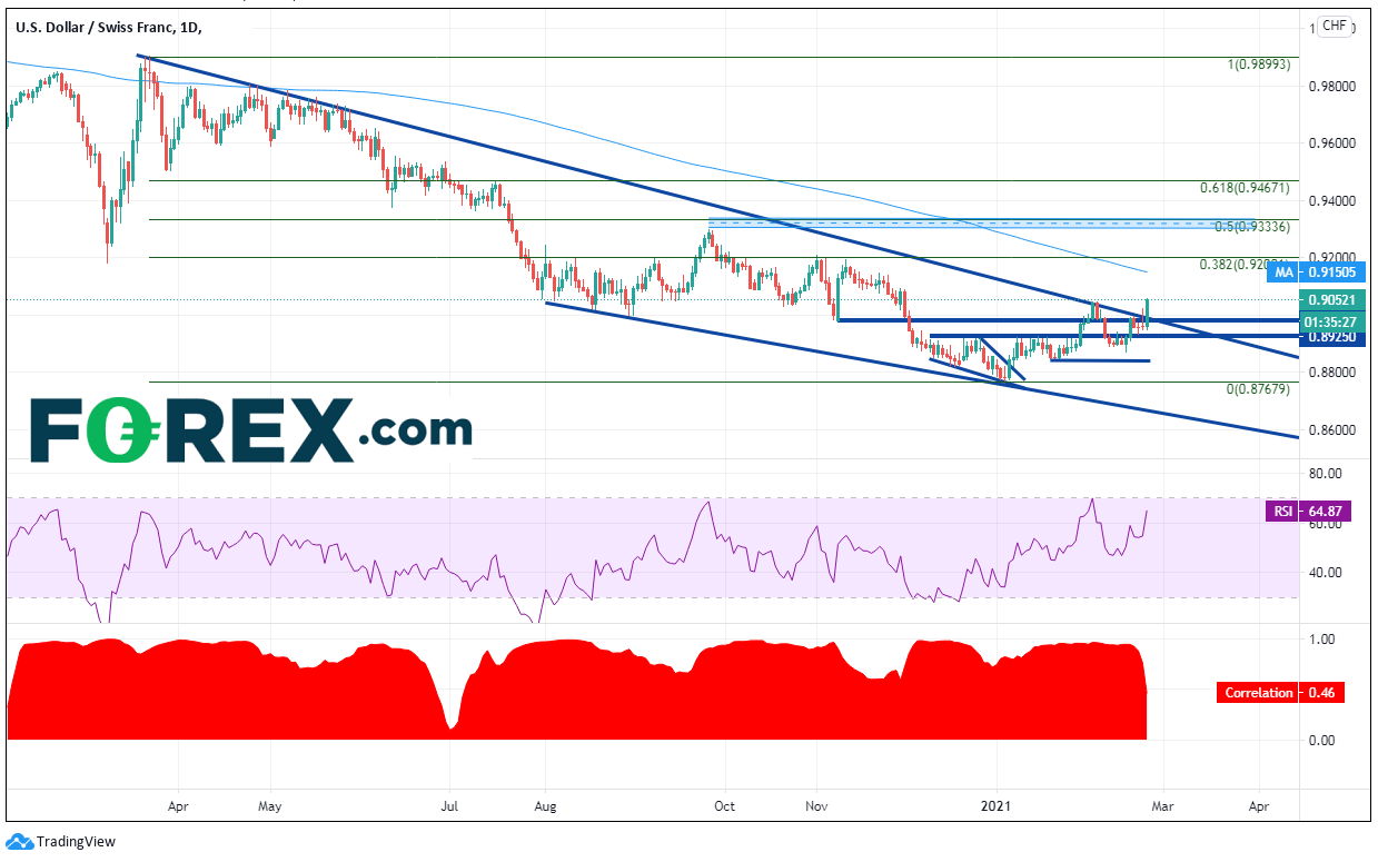 在2021年大部分时间里,美元指数(DXY)和美元/瑞郎一直呈同向走势。一个多月以来,两者相关系数保持在0.90上方。相关系数+1.00则意味着两种资产在100%的时间内走势同向。许多可能无法交易美元指数的外汇交易员一直在以美元/瑞郎作为前者的交易代理。鉴于两者间相关性高企,如果有人预判美元指数将上行,他就会买入美元/瑞郎。