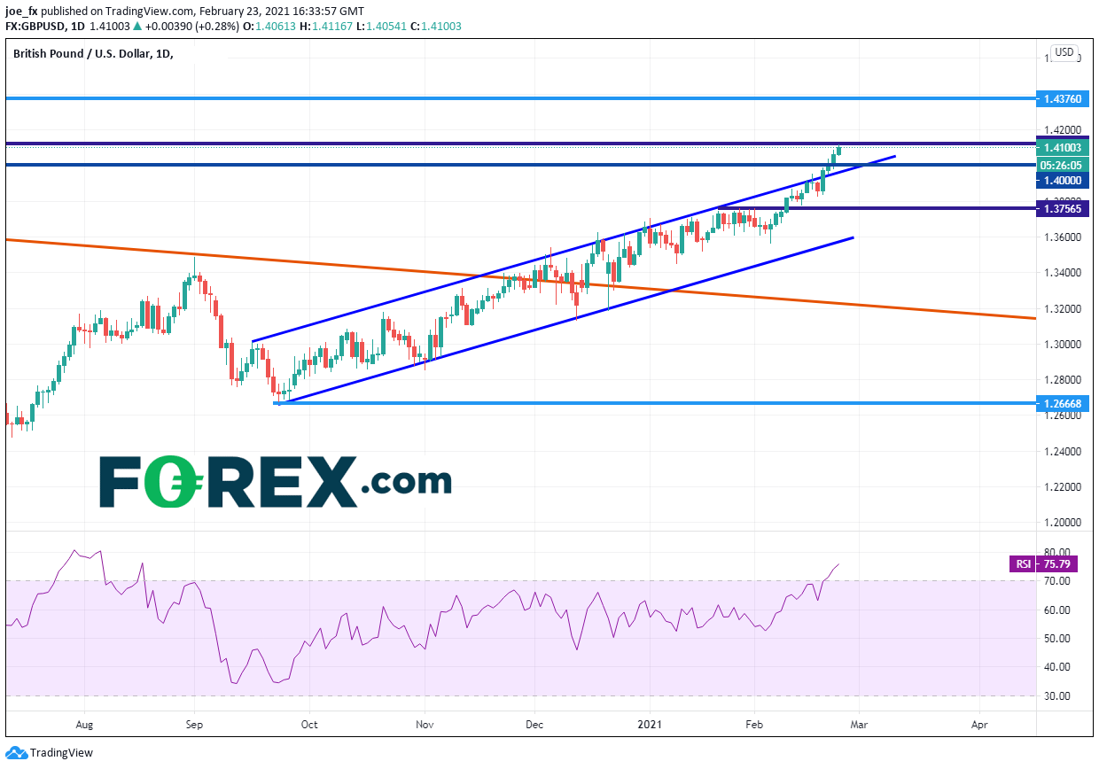 英镑/美元2月18日升穿部分关键价位。货币对不仅拿下11月以来通道上方趋势线,还上破心理阻力1.4000,逼近2018年春水平阻力 1.4120。日RSI已进入超买区域,达到75.87,因此汇价或面临回调。鉴于所有好消息都已明朗,货币对会不会回落?支撑位汇合点回看该通道上行趋势线和1.4000。若失守,汇价或探向前支撑位1.3750附近。但请注意,如果价格真的重新站上1.4120,或攻向2018年春高点1.4376。要留意,在超买情况下,回调或导致弱势多仓出场。