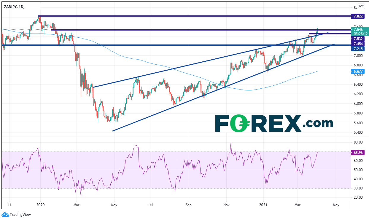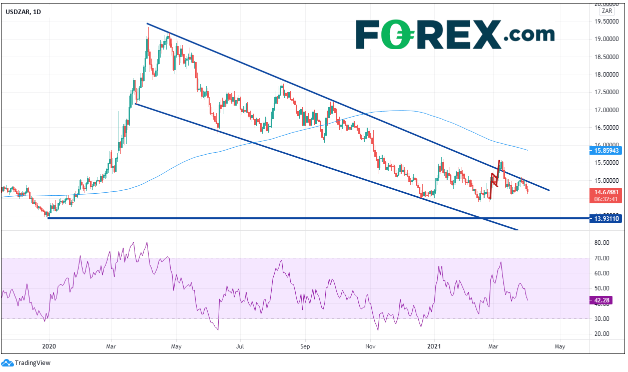 今年日元兑多种货币走势疲弱。不过,兰特兑英镑也表现亮眼。与美元一样,英镑/南非兰特自2020年4月大流行高点以来一直处在下斜通道内。货币对12月底弹离水平支撑位和该通道底部下斜趋势线。然后,3月反弹至趋势线上方,让RSI得以回升。货币对目前正在测试2020年12月22日低点至3月8日高点上行之61.8%斐波那契回档位20.1850附近。2月15日低点处于略下方的20.035位置,然后是19.38附近12月22日低点。阻力位落在3月29日高点20.7985附近,然后是200日均线切入位21.0481。不过,就像美元一样,日RSI处于中性区域,底部趋势线目前落在18.40附近。因此,价格或仍有下行空间。