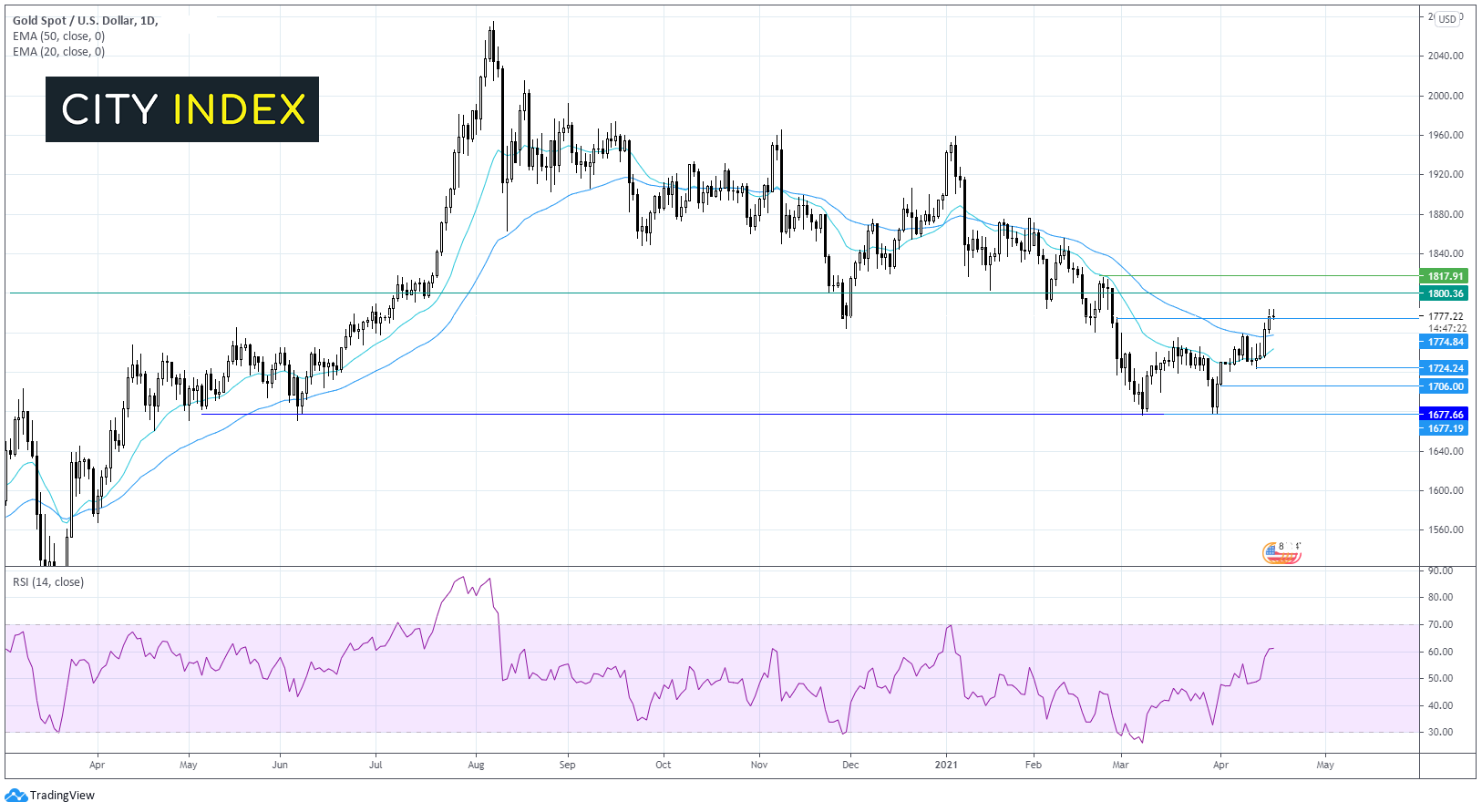 该贵金属刚刚升穿1775,巩固双底反转形态,表明黄金或继续走高。