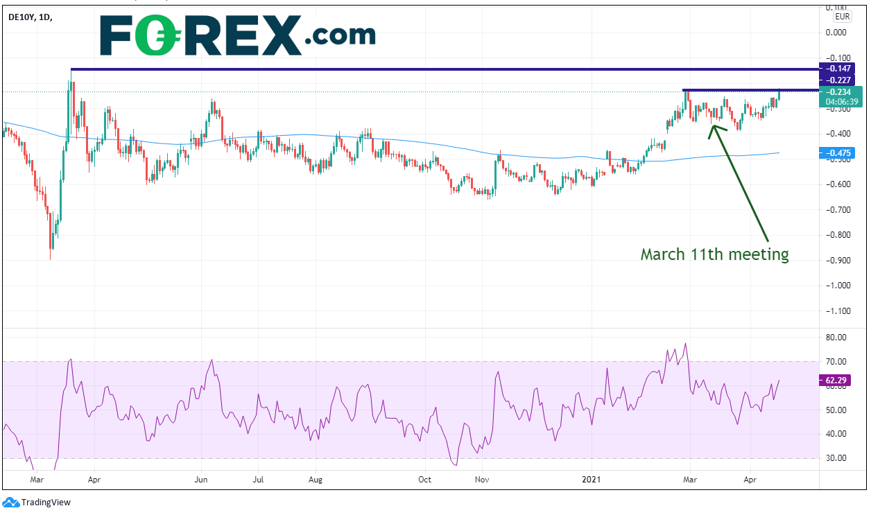 欧洲央行上次会议是在3月11日。欧元/美元当时交投于1.1950附近,德债殖利率交投于-0.35附近。3月会议上展望一片光明,也许还有些过于光明,央行上修了增长和通胀预期。彼时许多国家都处于限制和封锁之下,所有人都在关注殖利率的攀升,还有人认为欧元价值也过于高企了。3月11日会议结论是,欧洲央行将根据紧急抗疫购债计划(PEPP)加快购债步伐,殖利率和欧元此后确实推低,但跌势仅持续了很短的一段时间。
