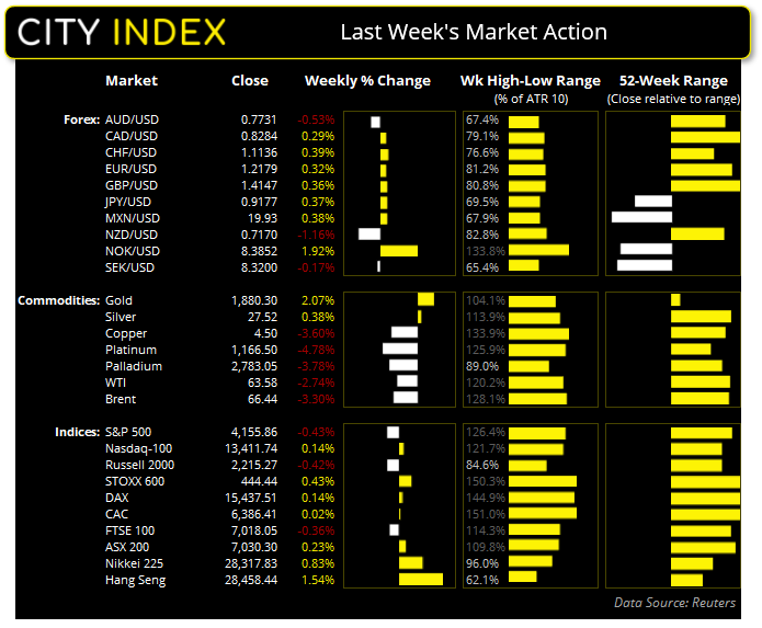 STOX 50和DAX等欧洲股指围绕着10周指数移动均线形成多个锤子K线,但“买入尾巴”(即下影线)没有伴随着上破创下新高。所以,日图基本上就是在一个持续三周的、边界模糊的区间内“上窜下跳”。所以,逆势做空的头寸可能希望在近期高点附近寻找势竭证据,而多头可能等待明确的突破。