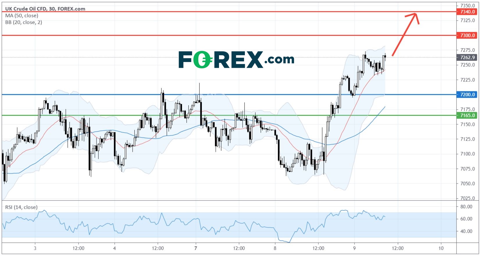 盘中趋势仍然看涨,英国原油CFD将向上行目标7,300点和7,340点进发。若跌破主要支持 (止损) 位7,200点 (近布林带下线),将反转看跌。