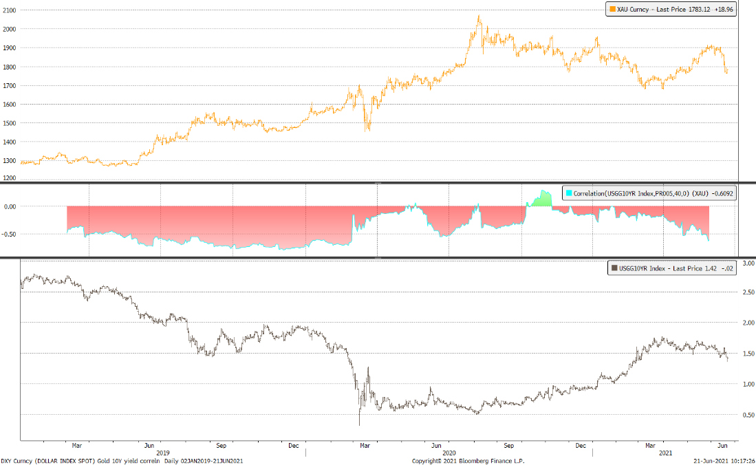 黄金、10年期美债殖利率与两者之间的相关性
