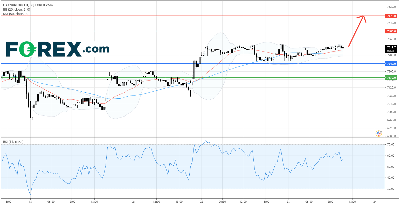 只要美国原油CFD守在主要支持 (止损) 位7,240点之上,预计可挑战7,400点和7,475点作上行目标。