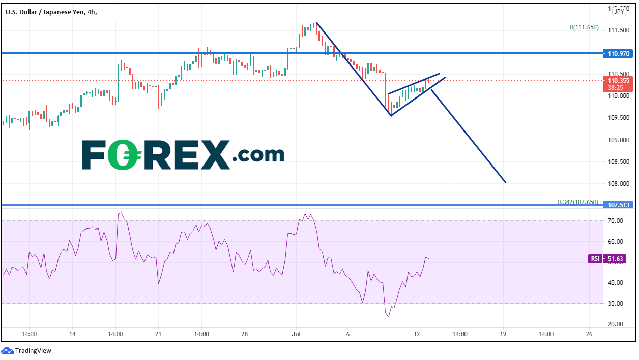 美元/日元4小时图走势和10年期美债殖利率相似。进入非农就业时交投于3月末高点110.97上方,非农就业发布时RSI超买,美元/日元也开始跟随殖利率下跌。周五自109.53的反弹似乎属于修正,构筑了三角旗(请注意RSI超卖)。下破110.00的话剑指108.00。2020年3月低点到7月2日高点的38.2%回档位在遥远的107.51。和殖利率一样,美元/日元如果到达目标,也丝毫无损于其较长期技术面。