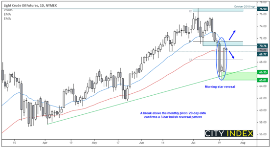 WTI期货在周二构筑小型看涨锤子线,表明空头正在失去控制权,昨天价格几乎收复周一全部失地,收于50日均线略上方。现已形成三K看涨反转形态(晨星反转),暗示修正低点已经就位,若升穿月线图中枢点/20日均线,则确认反转,趋势有望继续。若价格先行于昨日区间内部回撤下挫,我们将于月线图一号支撑位附近做多。