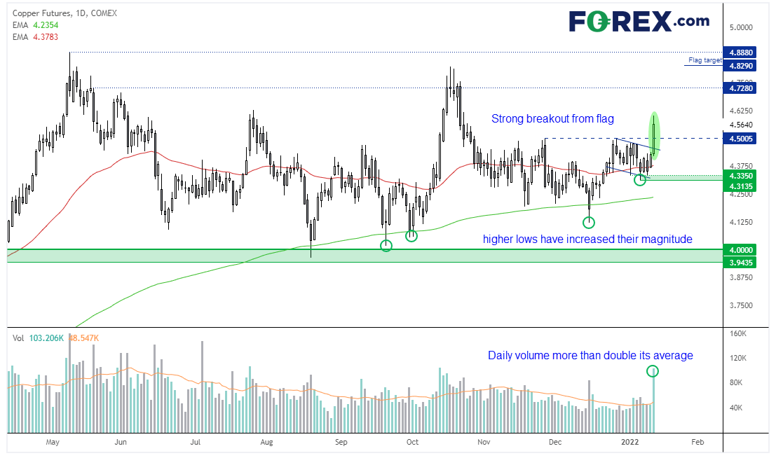 我们在昨天欧洲市场开盘前指出铜有突破的潜力,结果也不负我们所望。铜最高涨幅超过4%,日成交量达到日均成交量两倍以上,属于日图突破旗形后的经典情况。旗形突破后的测量目标在10月高点4.83附近,并且铜价轻松收上4.50阻力位。从在4.00低点以来缓慢构筑底部且上抬低点大量增加判断,铜价有可能重返其长期趋势。但目前我们乐于在守住4.30低点时上看4.75附近高点。但要证实旗形形态成立,铜价不得回到旗形下方。