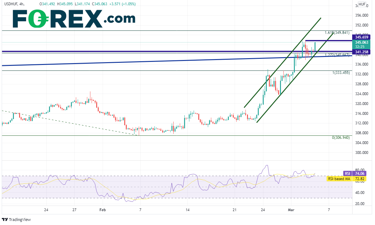 美元/匈牙利福林和美元/俄罗斯卢布之间目前的相关系数为+0.95,日图存在强相关性。美元/匈牙利福林昨天刺穿历史新高341.25附近,但未能收于其上。该货币对还站上2021年3月9日以来的长期水平趋势线。