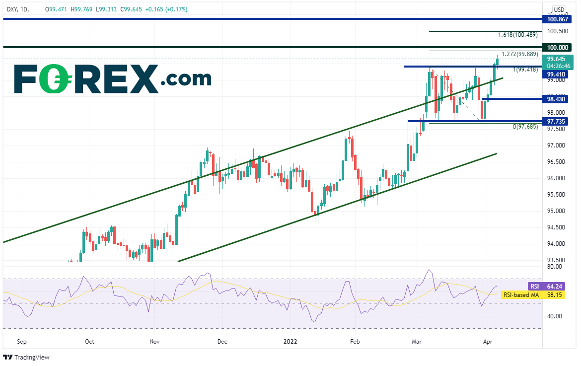 美元指数继续上攻100,上看第一阻力99.89,那是3月7日高点到3月30日低点行情的127.2%扩展位。如果攻克,可望上攻100.00的整数心理大关、前述行情的161.8%扩展位。下方支撑位在今天低点99.31附近、长期通道的上轨上斜趋势线99.00附近、水平支撑位98.43。