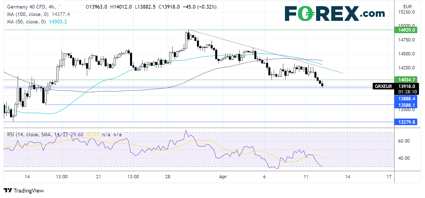 3月底以来DAX一直趋于下行,目前4小时图交投于下降趋势线、50和100期简单移动均线之下。