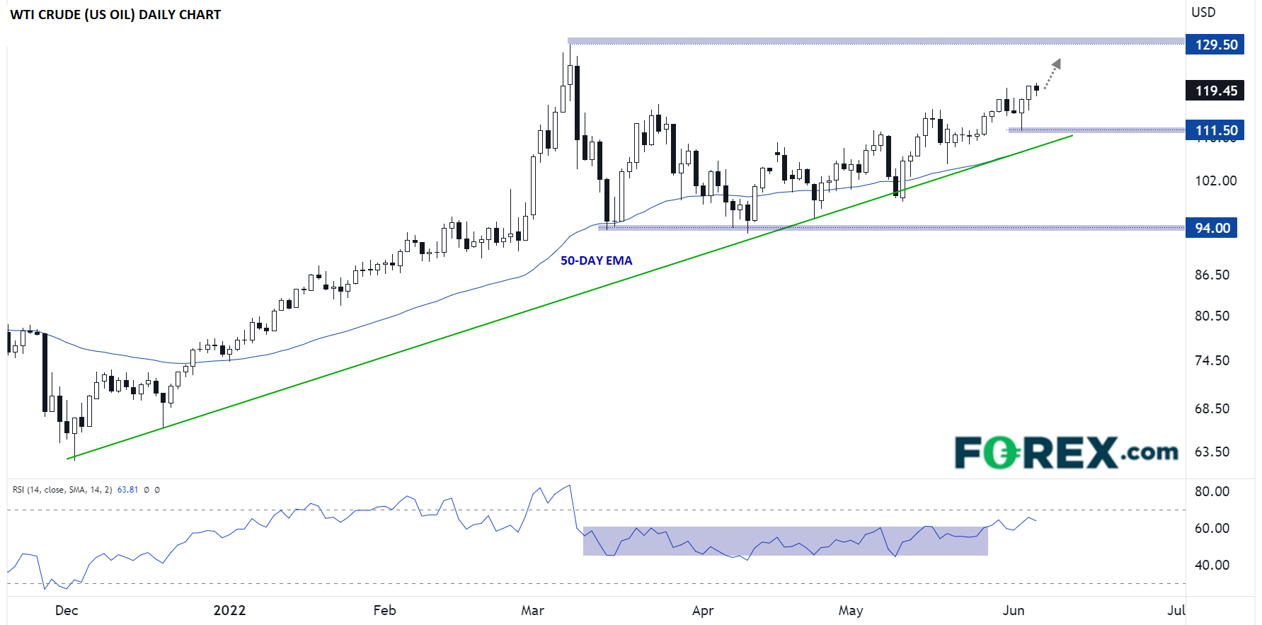 如上所述,油价业已上涨数月,截至目前的最高点是3月初创下的130一线。之后的4月和5月初围绕100盘整,现在多头再度蓄力,看高一线。