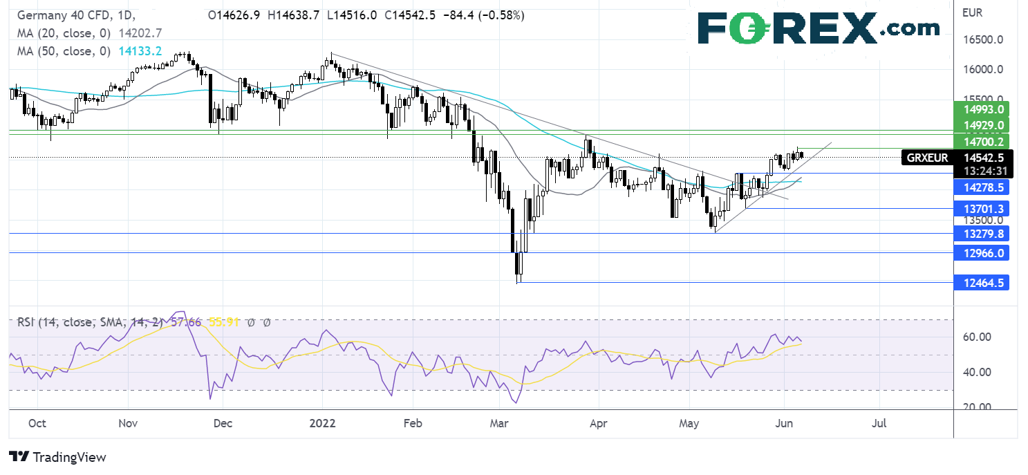DAX扩大了自5月低点13280反弹的行情,站上了持续数月的下降趋势线和一月之久的上升趋势线。20期均线上穿50期均线,RSI守在看涨区域。