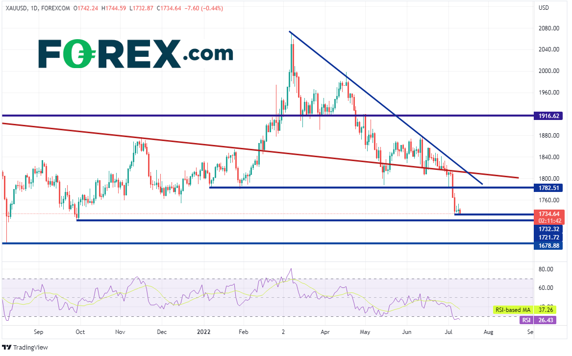 在美元指数日图持续上涨之际,现货黄金/美元不断下跌,今天考验7月5日低点,也是2021年9月30日以来最低点1732.32。如果美元指数继续走高,黄金可能下跌。第一支撑位就在下方不远处的2021年9月29日低点1721.72,然后可能下看8月9日以来低点兼三底所在的1679.13。但请注意,黄金价格的RSI超卖(就好像美元指数的RSI超买)。如果黄金(与美元指数)价格反转,上档第一阻力在遥远的1782.51。攻克的话可以摸至7月5日高点兼2020年9月1日以来长期下降趋势线(请看红色线),以及3月8日近期高点以来的下降趋势线1830。