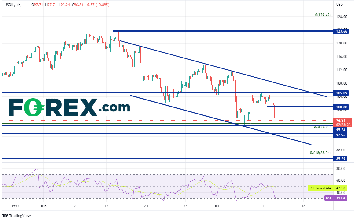 西得州原油一度尝试测试3月8日高点,后调头向下。6月14日最高仅到达123.66,然后开始下跌,上周最低触及95.13,略低于2021年12月2日低点到3月8日高点行情的50%回档位和水平支撑位。油价之后回升至105.09附近的水平阻力位,但再度开始走弱。油价今天考验上周以来的近期低点,此文发稿时下跌7美元,失守96.50。
