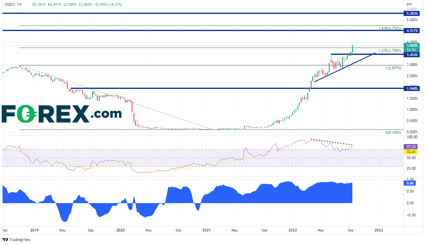 美国2年期债券收益率和美元在周图上高度相关。下图底部显示两者目前的相关系数为+0.86,高于表明强相关的+0.80。因此,要想捕捉美元趋势,交易员须得观察2年期债券收益率的走势。此收益率本周最高到达2007年11月以来最高点,还站上2018年11月高点到2021年2月疫情期间低点的127.2%扩展位3.854%附近。另请注意,收益率的RSI曾进入超买区域,与收益率背离,但已在回到中性区域后再次调头向上,目前与收益率同步。收益率下个阻力在比较遥远的2007年以来阻力4.517%,如果攻克,可能到达前述行情的161.8%扩展位4.752%。下档支撑先后有6月高点3.454%附近、4月初以来上升趋势线3.057%附近。
