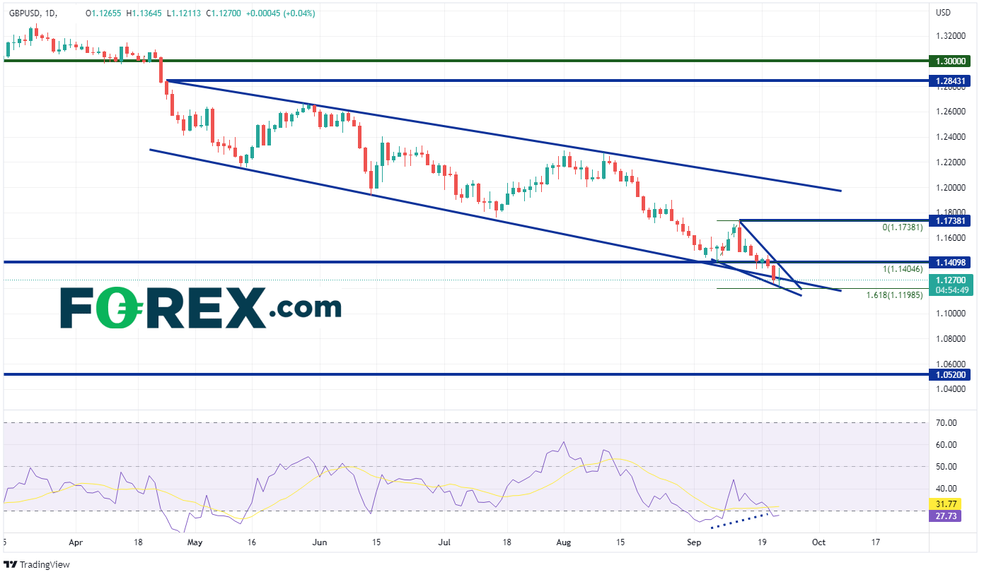 英镑/美元如果继续下跌,下方第一支撑位在9月7日低点到9月13日高点行情的161.8%扩展位,即1.1198附近,那也是楔形的下轨趋势线所在。如果下破,下个支撑位在较遥远的1.0520,那是1985年低点。但请注意,RSI在超卖区域与价格背离,暗示价格或准备回升。如果价格确实回升,上方第一个阻力位在周四高点与楔形上轨趋势线1.1365附近。如果攻克,可望摸至前支撑位1.1410、9月13日以来高点1.1738(也是下降楔形上破后的目标所在)。